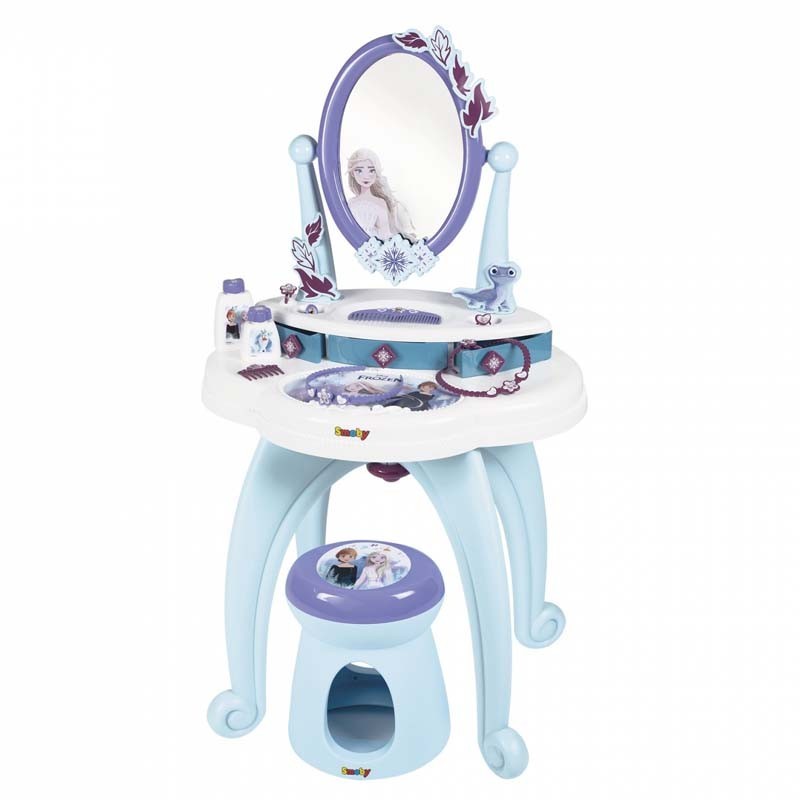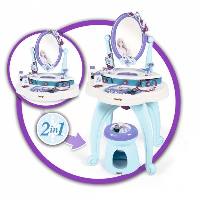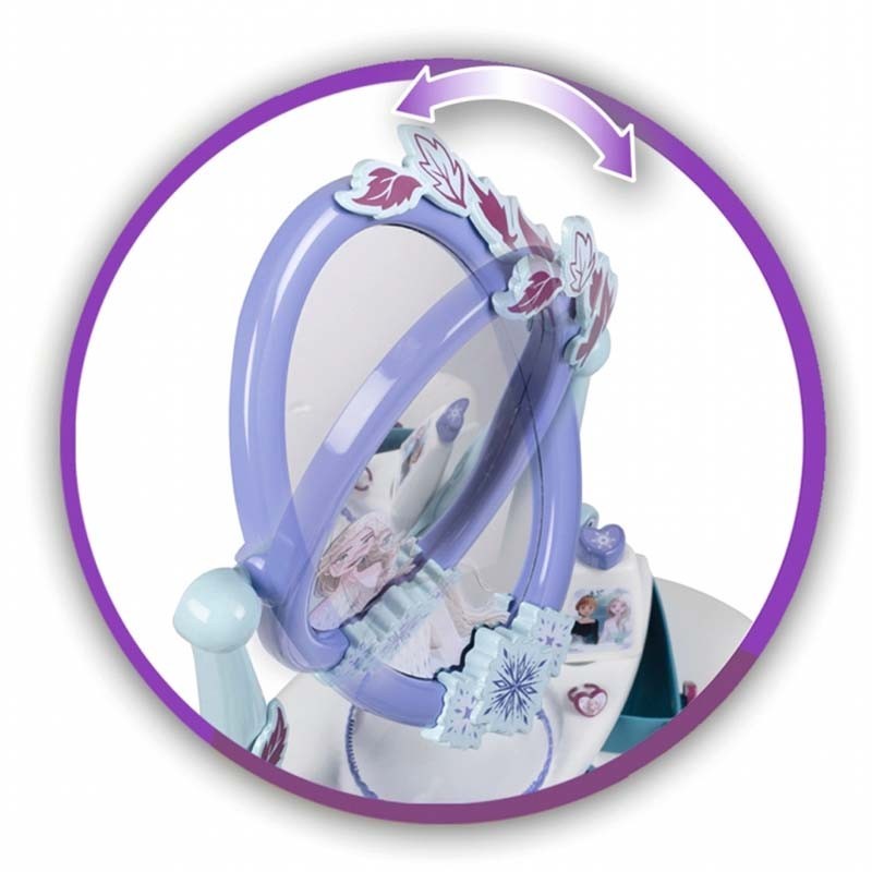 На самом столике в ячейках и ящиках можно удобно разместить все принадлежности девочки. А если необходимо, верхняя часть легко снимается и ее можно положить где угодно на Ваш выбор. Зеркальце украшено в стиле Frozen и прекрасно впишется в интерьер любой детской комнатки и не только, благодаря прекрасно подобранной цветовой гамме. Кроме этого зеркальце может вращаться, что делает его удобным в реальной эксплуатации. В комплекте идет и маленький стульчик, что пригодится Вашей доченьке. А в наборе аксессуаров есть много всего, например 2 флакона, несколько расчесок и обруч для волос, браслет, колье и 3 колечка.