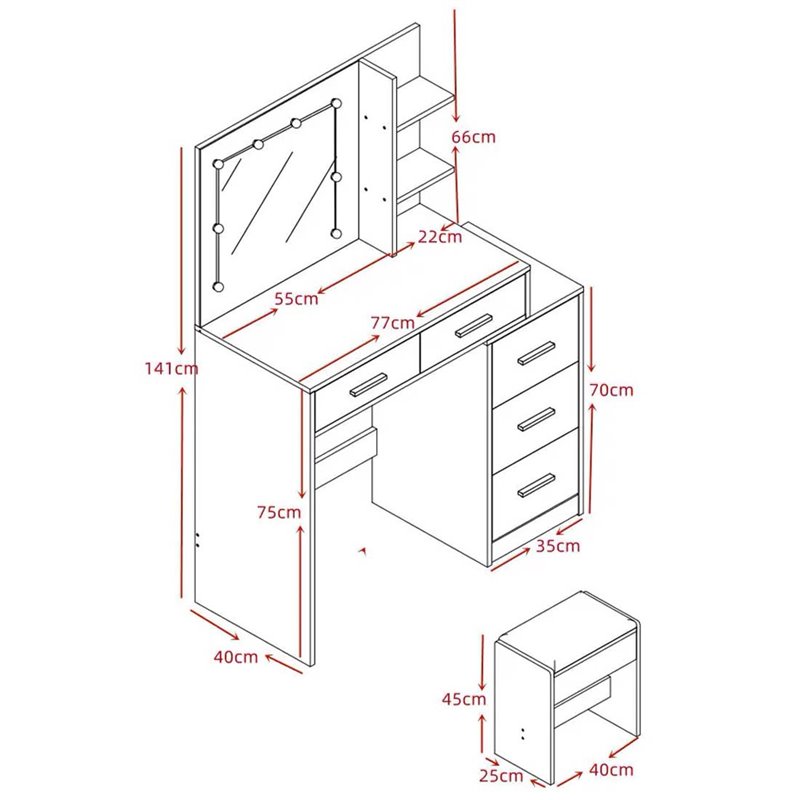 Туалетный столик Avko в скандинавском стиле с LED подсветкой – это отличное решение для оформления вашей спальни, независимо от того, понравитесь ли вы традиционный или современный стиль. Его большое зеркало позволит вам создать отличный образ и сопоставить свой внешний вид. Практические ящики обеспечат хранение разных вещей, помогая поддерживать порядок и держать все в одном месте. Комфортный стул, входящий в комплект, сделает ежедневный макияж приятным процессом. Туалетный столик изготовлен с большим вниманием к деталям и качеству. Все хорошо упаковано внутри коробки, а сборка не требует специальных навыков или инструментов – комод будет собран в течение 20-30 минут.
