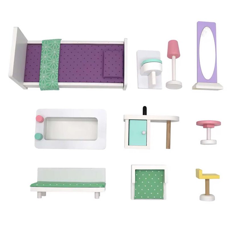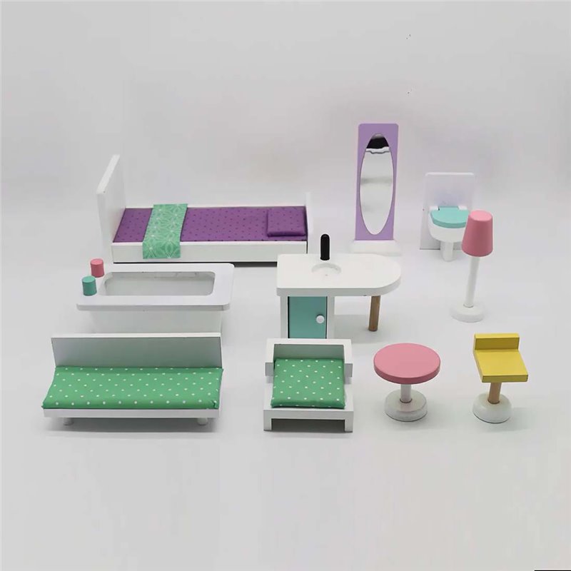 Набор из 10 деревянных предметов: стол + 2 стула, диван, тумба, рояль, лампа, табурет, кровать, туалет, ванна, зонтик;