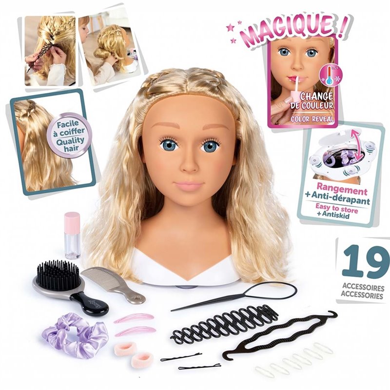 1 щетка, 1 расческа, 1 тканевая резинка для волос, 2 цветные резинки, 6 прозрачных резинок, 2 зажима, 2 плоских зажима, 1 тюбик блеска и 3 инструмента для укладки волос, которые помогут создать изящные косы, пучки и хвостики. Все аксессуары можно использовать даже для создания причесок ребенку. Малыш также сможет изучить советы и приемы создания простых или смелых причесок благодаря карточкам с руководствами по прическам, которые снимаются с упаковки. Ваш ребенок сможет даже изменить цвет губ благодаря термочувствительному макияжу. Просто нанесите ледяную воду на губы с помощью тюбика с блеском для невероятного эффекта. Надежное удержание изделия при использовании обеспечат три присоски, расположенные на манекене.