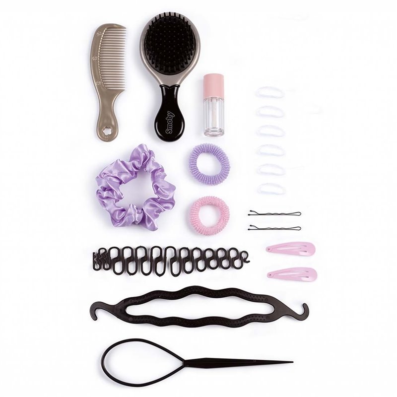 - В комплекте есть следующие аксессуары: 1 щетка, 1 расческа, 1 тканевая резинка для волос, 2 цветные резинки, 6 прозрачных резинок, 2 зажима, 2 плоских зажима, 1 тюбик блеска и 3 инструмента для укладки волос.