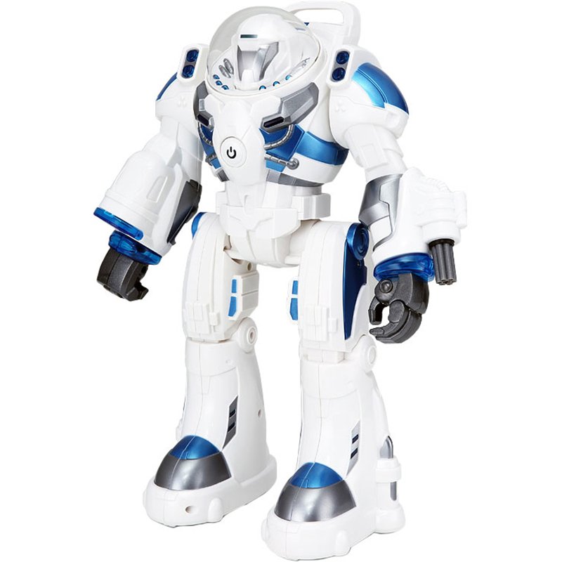 Робот шагает и ездит вперед, назад, вправо и влево, а также танцует, двигает руками. Вместе с ним очень весело вести бои, потому что он умеет стрелять дисками (правая рука) и пулями (левая рука).