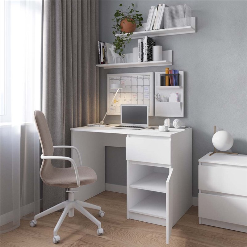 Современный письменный стол от известного производителя мебели Vays серия R-18 предназначен как для детей, так и для взрослых, компактный и удобный вариант для работы, обучения или использования на дому. Стол предназначен для длительной эксплуатации и способен выдерживать большие нагрузки. Стол изготовлен из ламинированного ДСП толщиной 16 мм, столешница и фасады кромка ПВХ 2 мм. Стол с правой стороны имеет тумбу с одним выдвижным ящиком и дверцей за которой находится отделение с полочками для хранения канцелярии, документов и личных вещей. Ящик оснащен телескопическими направляющими. Оптимальные габариты стола Vays R-18, а это 100x60x75 см позволяют комфортно разместить ноутбук, канцелярию и другие рабочие аксессуары, не занимая много места в комнате или офисе. Большое количество цветовых комбинаций корпуса и фасадов помогут легко подобрать стол к вашему интерьеру.