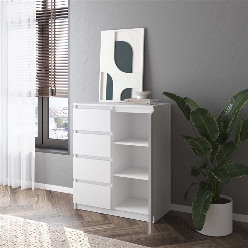 Современный комод от украинской мебельной фабрики Vays R-32, безусловно, является оригинальным дополнением вашего современного интерьера. Благодаря компактным размерам модель идеально подходит для размещения телевизора, декора и хранения вещей. Комод оснащен четырьмя глубокими ящиками без ручек и одной дверцей, за которой находится отделениями с полками, что позволяет удобно организовать пространство. Корпус и фасады изготовлены из качественной ламинированной ДСП 16 мм, которая обеспечивает долговечность, легкий уход и привлекательный внешний вид. Отсутствие ручек подчеркивает минималистичный стиль и делает комод универсальным для современных интерьеров.