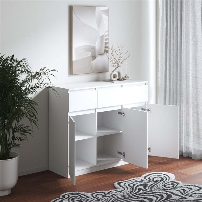 Современный комод от украинской мебельной фабрики Vays R-33, безусловно, является оригинальным дополнением вашего современного интерьера. Благодаря компактным размерам 120×40×98 см модель идеально подходит для размещения телевизора, декора и хранения вещей. Комод оснащен тремя глубокими ящиками без ручек и тремя дверями, за которыми находится отделение с полками, что позволяет удобно организовать пространство. Корпус и фасады изготовлены из качественной ламинированной ДСП 16 мм, которая обеспечивает долговечность, легкий уход и привлекательный внешний вид. Отсутствие ручек подчеркивает минималистичный стиль и делает комод универсальным для современных интерьеров.