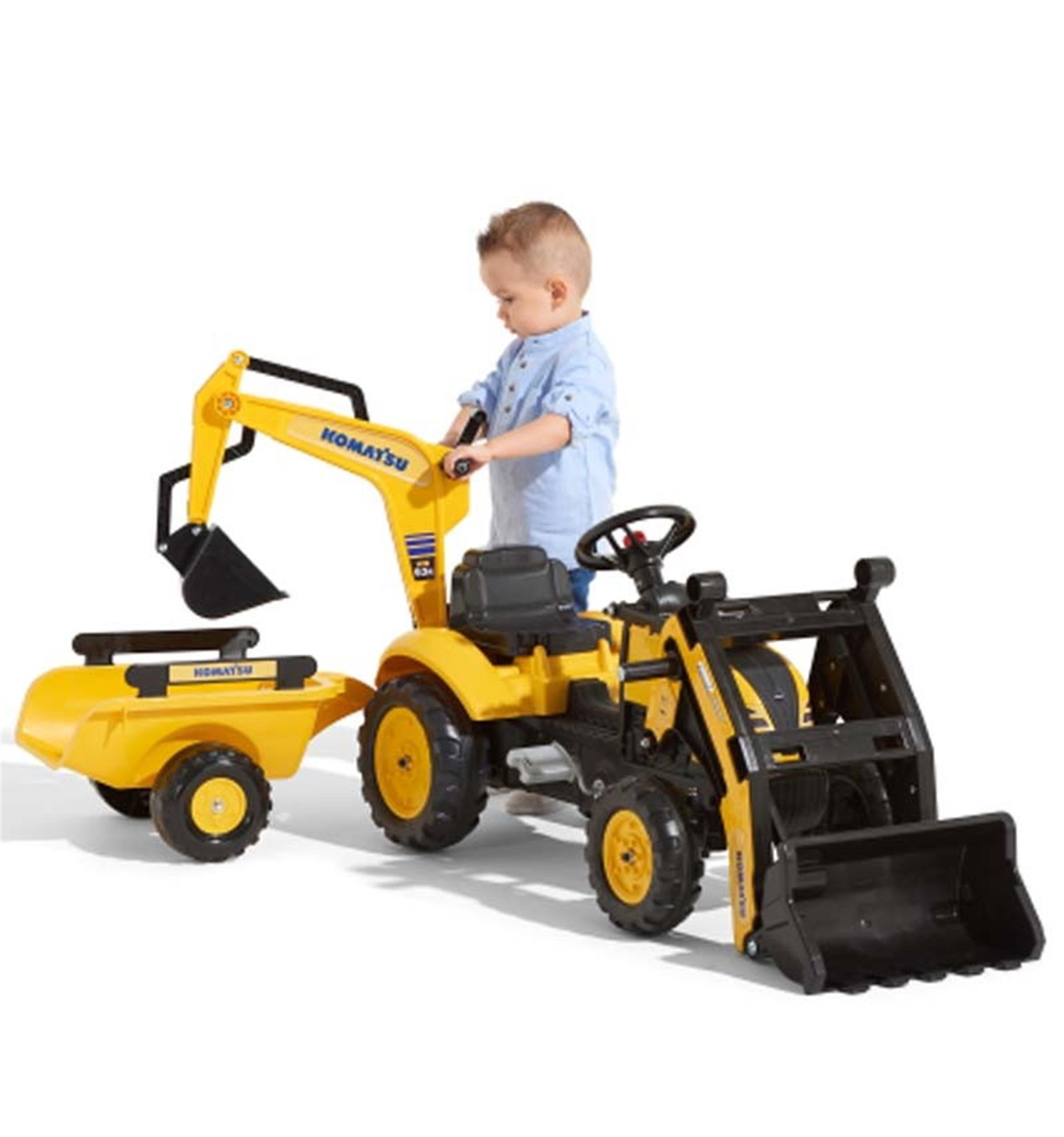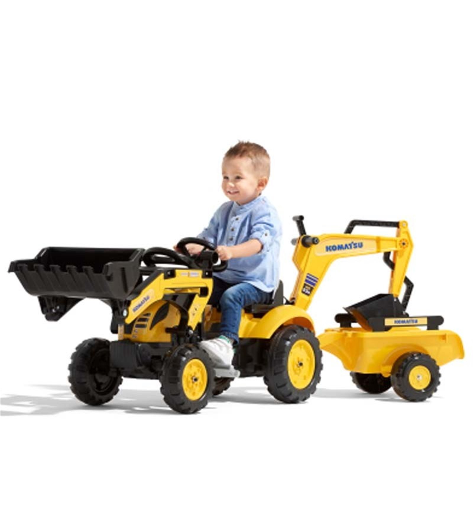 Цей трактор Falk Komatsu з переднім і заднім ковшем спеціально розроблений для маленьких шукачів пригод від 2 до 5 років, і є точною копією з педалями справжнього трактора Komatsu. Ви можете легко прикріпити причіп з бічними панелями, що дозволить транспортувати пісок, листя, ґрунт і каміння з одного кінця саду в інший.