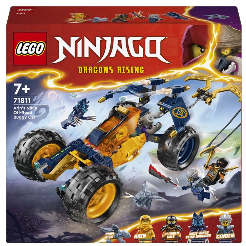 Хлопчики й дівчатка віком від 7 років можуть відтворити захопливі битви з другого сезону телесеріалу NINJAGO®. Повстання драконів можна відтворити завдяки набору LEGO® NINJAGO Багі для бездоріжжя ніндзя Арін (71811). Цей пригодницький набір для дітей містить іграшковий автомобіль Аріна жовтого кольору з рухомими колесами, підвіскою, кабіною, що відкривається, місцем для двох мініфігурок, двома шутерами з шістьма шипами для стрільби й великим гаком на задній панелі, що допомагає ловити лиходіїв.
