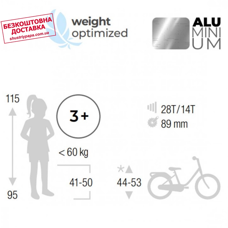 Велосипед має багату комплектацію:підставка (підніжка) для паркування, багажник, захист ланцюга, пластикова окантовка на крилі переднього колеса, передній та задній світловідбивачі, Air Bag (подушечка безпеки) на кермі, дзвіночок. Колеса, рульова вилка і педалі велосипеда містять високоякісні шарикопідшипники, що гарантує відмінну керованість, легкий хід педалей і швидке навчання.