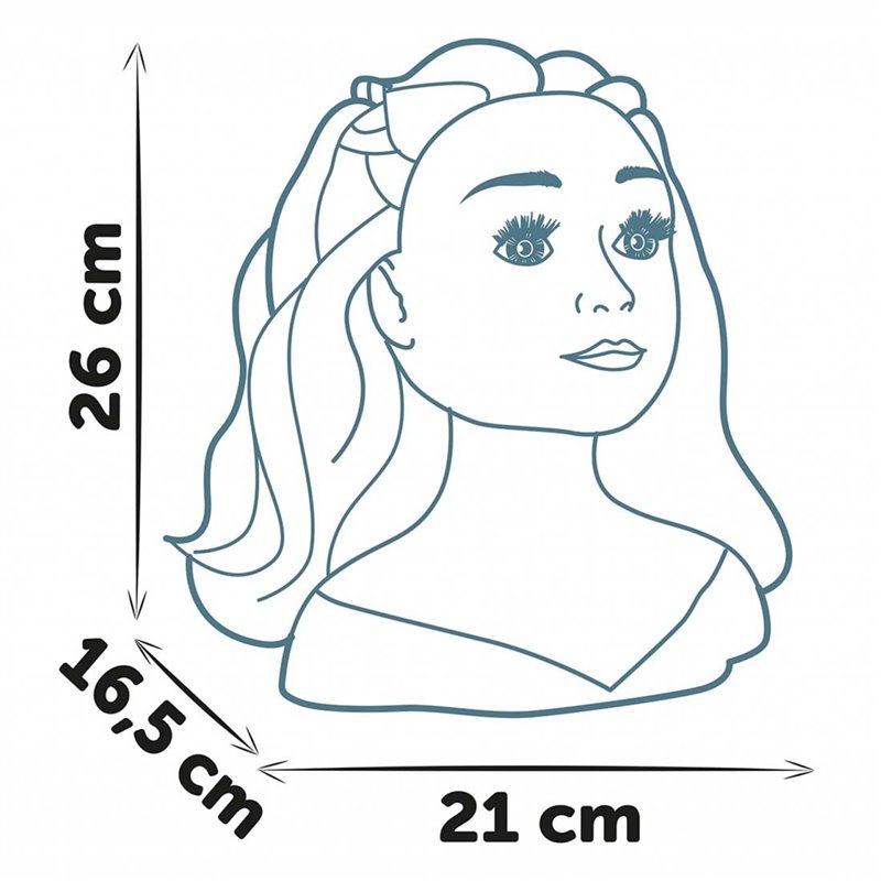 1 щітка, 1 гребінець, 1 тканинна резинка для волосся, 2 кольорові гумки, 6 прозорих гумок, 2 затискачі, 2 плоскі затискачі, 1 тюбик блиску та 3 інструменти для укладання волосся, які допоможуть створити витончені коси, пучки та хвостики. Усі аксесуари можна використовувати навіть для створення власних зачісок дитині. Малюк також зможе вивчити поради та прийоми створення простих або сміливих зачісок завдяки карткам із посібниками із зачісок, які знімаються з упаковки. Ваша дитина зможе навіть змінити колір губ завдяки термочутливому макіяжу. Просто нанесіть крижану воду на губи за допомогою тюбика з блиском для неймовірного ефекту. Надійне утримання виробу під час використання забезпечать три присоски, які розташовані на манекені.