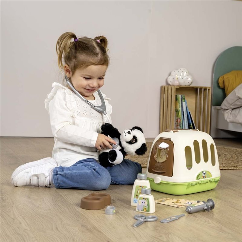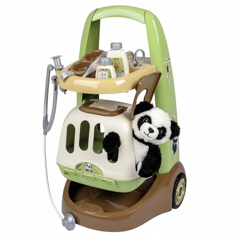Завдяки ігровому набору Smoby Візок для догляду за тваринами з пандою, переноскою, та аксесуарами, ваша дитина зможете стати справжнім ветеринаром зоопарку і подбати про всіх тварин. Завдяки колесам ви можете транспортувати його в будь-яку точку будинку.Численні аксесуари, що входять у комплект, дозволять вашому малюку спочатку подбати про свою панду, яка входить в комплект набору, а потім і про інших іграшок. У набір входить: 1 шприц, 1 термометр, 1 стетоскоп, 1 пара ножиць, 1 миска, 2 пляшечки (сироп, шампунь), 1 бинт і 1 браслет. У комплект входить 1 чарівна плюшева іграшка панда. Завдяки кейсу 2 в 1 ви можете транспортувати все своє медичне обладнання та надати допомогу в будь-який час. Дверцята клітки мають отвір, щоб ви могли бачити панду, коли вона всередині. Завдяки ручці у верхній частині клітки ваша дитина можете легко носити свій футляр куди завгодно. Окрім використання його як транспортної клітки, дитина також можете використовувати його як простий ветеринарний футляр, знявши верх. За допомогою цього набору ваш малюк зиоже відчути себе справжнім ветеренаром, та допомагати своїм домашнім улюбленцям.Колір товару може дещо відрізнятися від кольору на фото в залежності від індивідуальних налаштувань Вашого монітора.