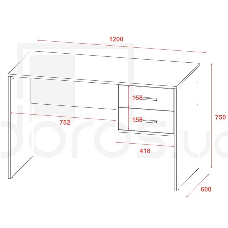 Якісний офісний стіл від відомої меблевої компанії Doros в розмірі 1200х600, призначений як для дітей, так і для дорослих. Стіл призначений для тривалої експлуатації і здатний витримувати великі навантаження. Стіл має дві шухляди на роликових направляючих, та виготовлений з ламінованого ДСП товщиною 16 мм. Завдяки сучасному дизайну стіл органічно впишеться в інтер'єр будь-якого сучасного ремонту в квартирі, він займає мінімум корисної площі, чудово вписується в малогабаритні кімнатки.