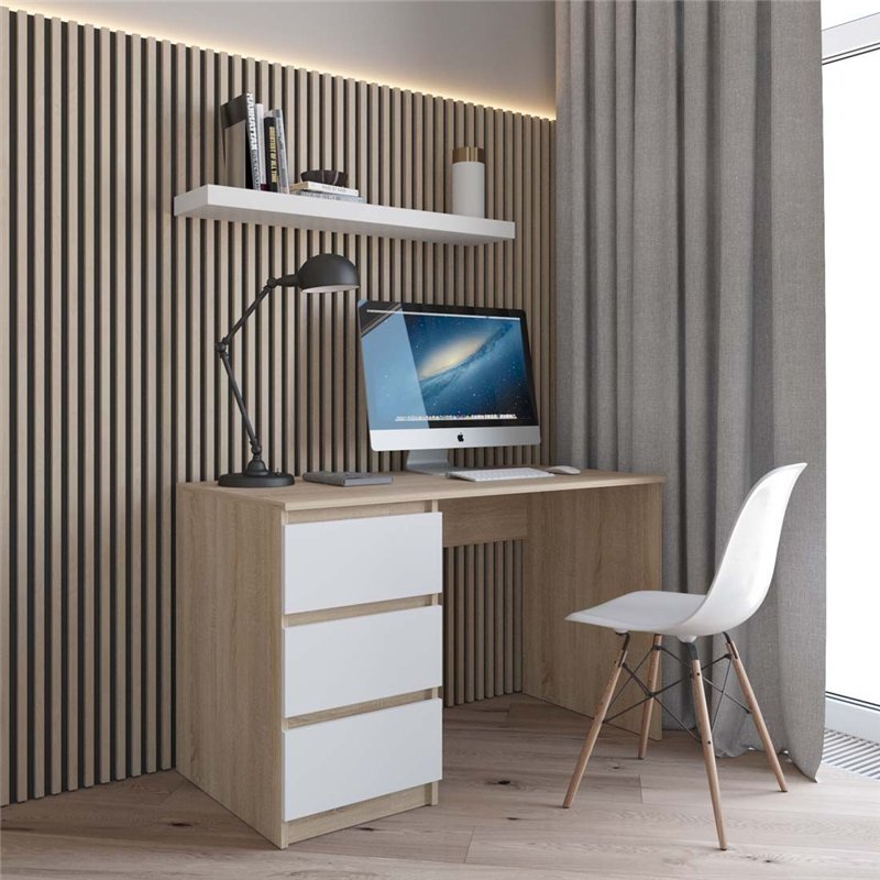 Якісний письмовий стіл від відомого виробника меблів Vays серія R-13, призначений як для дітей, так і для дорослих, компактний та зручний варіант для роботи, навчання або використання вдома. Стіл призначений для тривалої експлуатації і здатний витримувати великі навантаження. Стіл виготовлений з ламінованого ДСП товщиною 16 мм, а стільниця та фасади крайка ПВХ 2 мм. Задня стінка тумби виготовлена з ДСП, що надає всій конструкції додаткової міцності. Стіл із лівої сторони має тумбу з трьома висувними шухлядами. Шухляди оснащені телескопічними направляючими.