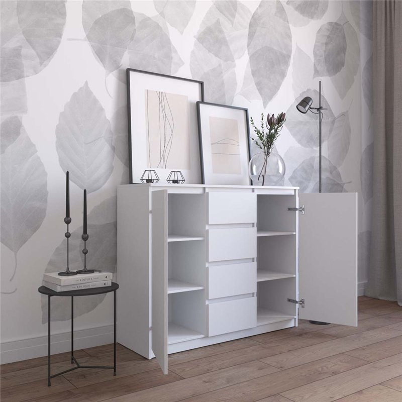 Сучасний комод від української меблевої фабрики Vays R-11, безперечно є оригінальним доповненням вашого сучасного інтерєру. Модель має 4 місткі шухляди для білизни, одягу чи аксесуарів, а також 2 відділення з полицями, які зручно використовувати для складених речей, коробок або документів. Корпус і фасади виготовлені з якісної ламінованої ДСП 16 мм, яка забезпечує довговічність, легкий догляд і привабливий зовнішній вигляд. Відсутність ручок підкреслює мінімалістичний стиль і робить комод універсальним для сучасних інтер’єрів.