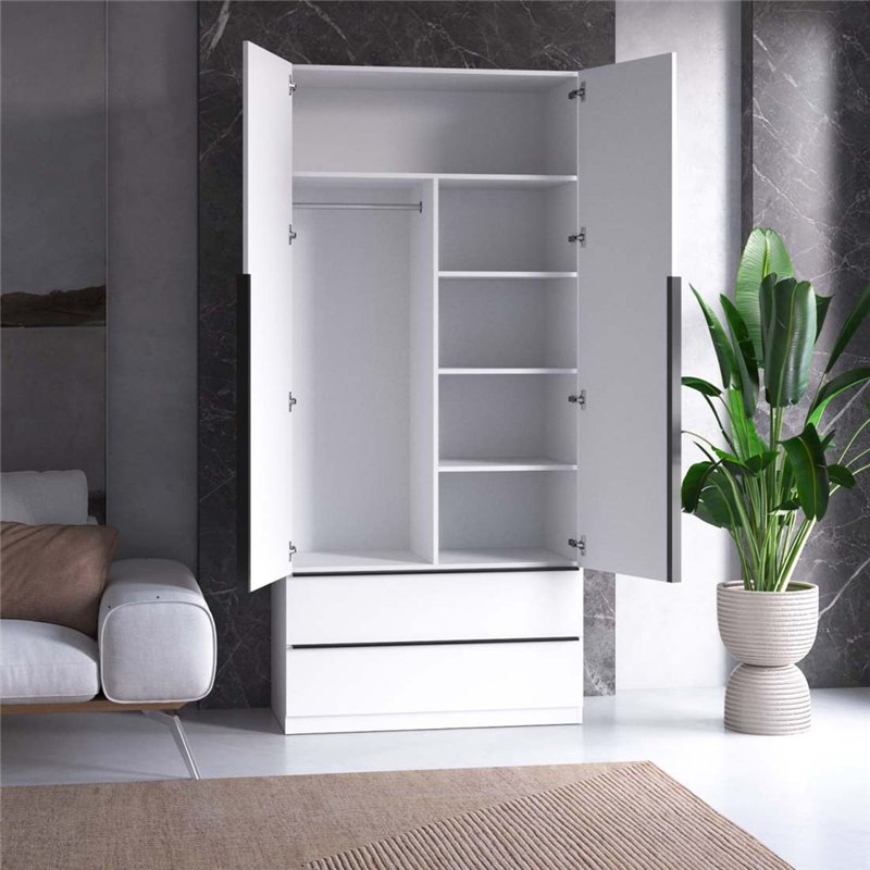 Шафа розпашна Vays M-30 - це функціональне рішення для спальні, вітальні чи передпокою. Завдяки продуманому наповненню — дві шухляди, штанга для вішаків та полиці — шафа зручно підходить для зберігання одягу, білизни, аксесуарів і взуття. Мінімалістичний дизайн без ручок додає сучасності, а міцна конструкція з Ламінованого ДСП товщиною 16 мм гарантує довговічність. Компактні розміри дозволяють розмістити шафу навіть у невеликому приміщенні.