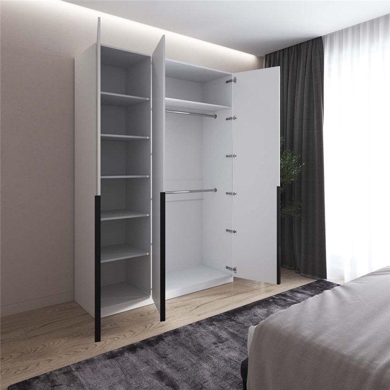 Шафа розпашна Vays M-32 - елегантна сучасна модель із двома секціями для зручного зберігання речей. Оснащена двома штангами для короткого одягу (сорочок, піджаків, спідниць, брюк) та зоною з полицями для білизни, взуття або аксесуарів. Стильні чорні довгі ручки додають контрасту та підкреслюють преміальний дизайн. Міцна конструкція з Ламінованого ДСП товщиною 16 мм гарантує довговічність.