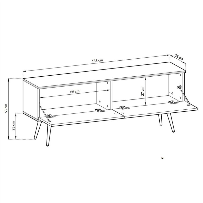 Завдяки сучасному дизайну комод-тумби під ТВ Perfect Home Oro RTV135 цей сучасний предмет дизайнерського рішення органічно впишеться в інтер'єр вашої спальні, або вітальні. Тумба призначена для тривалої експлуатації і здатна витримувати великі навантаження. Корпус і фасад тумби виготовлений із якісного ламінованого ДСП товщино 16 мм. Завдяки використанню в тумбі Oro RTV135 якісної фурнітури вона буде служити вам довго і приносити задоволення від приємної покупки. Тумба має 2 дверки. Чорні металеві ніжки, на яких стоїть тумба, додадуть акценту вашому дизайн-проекту.