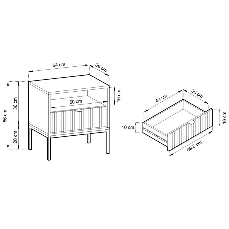 Завдяки сучасному дизайну приліжкова тумба Perfect Home Nova S54 органічно впишеться в сучасний інтер'єр вашої спальні, або дитячої кімнати. Тумба призначена для тривалої експлуатації і здатна витримувати великі навантаження. Корпус тумби виготовлений із якісного ламінованого ДСП, а фасад із структурного МДФ. В тумбі Nova S54 використано телескопічні напрямні повного висуву, що забезпечує легкість у відкритті шухляди та доступ до всіх її куточків. Окрім того ручка та ніжки виготовлені із металу, що забезпечить довгий термін служби, та оригінальний вигляд. Цей компактний предмет меблів можна використовувати для розміщення нічного світильника, книг, журналів і інших речей. Тумба має одну шухляду та відкриту поличку.