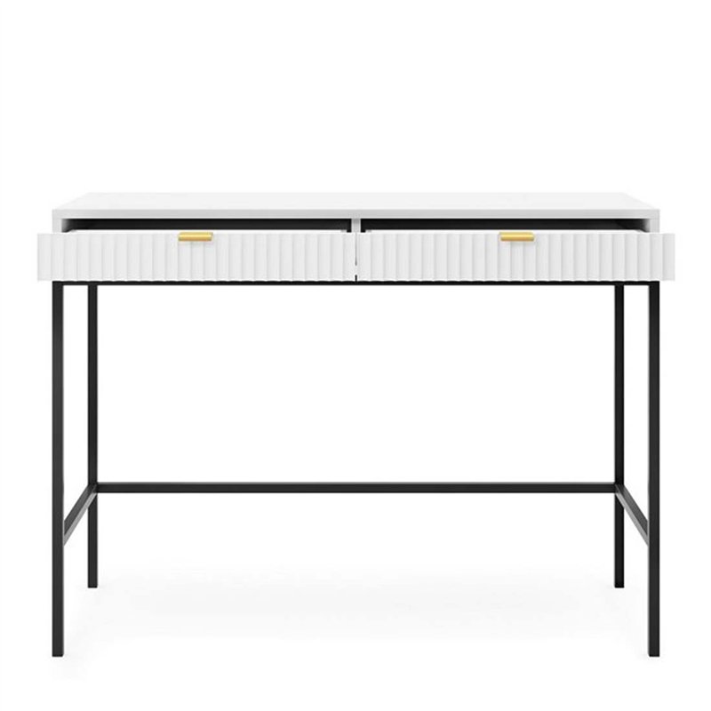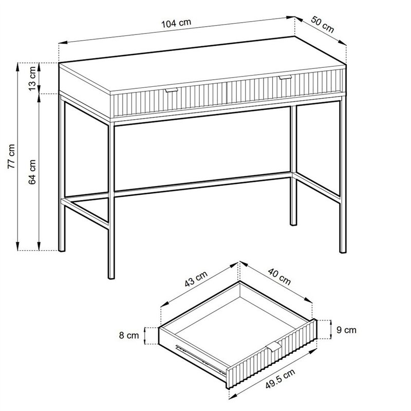 Туалетний стіл Perfect Home Nova T104 - це компактний, ергономічний, стильний і функціональний предмет інтер'єру. Корпус стола виготовлений із якісного ламінованого ДСП, а фасад із структурного МДФ. В столі Nova T104 використано телескопічні напрямні повного висуву, що забезпечує легкість у відкритті шухляди та доступ до всіх її куточків. Окрім того ручка та ніжки виготовлені із металу, що забезпечить довгий термін служби, та оригінальний вигляд. Він не тільки забезпечує комфортні умови для догляду за собою, а й організує зберігання таких необхідних дрібниць як косметика, прикраси, парфуми, галантерейні приналежності. А дві глибокі й місткі висувні шухляди дозволяють тримати потрібні речі завжди під рукою.