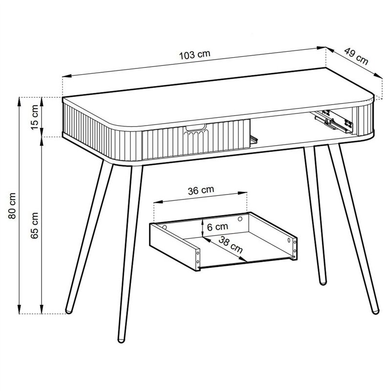 Туалетний стіл Perfect Home Zova T103 - це компактний, ергономічний, стильний і функціональний предмет інтер'єру. Корпус стола виготовлений із якісного ламінованого ДСП, а фасад із структурного МДФ. В столі Zova T103 використано телескопічні напрямні повного висуву з доводчиками, що забезпечує легкість у відкритті шухляди та доступ до всіх її куточків. Особливої уваги заслуговують втоплені у фасад ручки, які додають оригінальності всьому виробу. Ніжки в столика Zova T103 виготовлені із металу, що забезпечить довгий термін служби, та оригінальний вигляд. Столик не тільки забезпечує комфортні умови для догляду за собою, а й організує зберігання таких необхідних дрібниць як косметика, прикраси, парфуми, галантерейні приналежності. А дві глибокі й місткі висувні шухляди дозволяють тримати потрібні речі завжди під рукою.