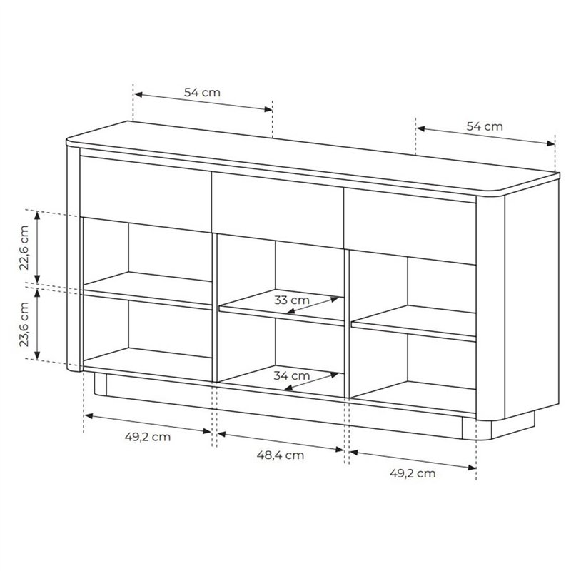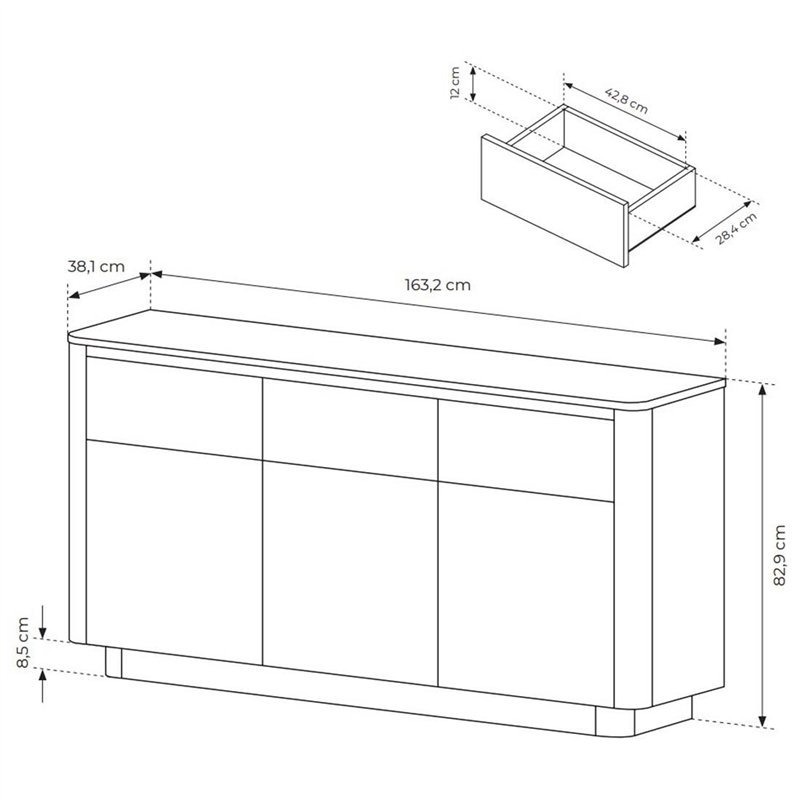 Сучасний комод Torro 3D3S/163 від польської меблевої фабрики Perfect Home, безперечно є оригінальним доповненням вашого сучасного інтерєру адже його особливістю є заокруглені форми, які підкреслюють сучасні трендові рішення в меблевій індустрії. Модель має 3 розпашні дверки, за якими розташовані полиці, які зручно використовувати для складених речей, коробок або документів, та 3 шухляди. Корпус та фасад комода виготовлений із якісного ламінованого ДСП, які забезпечують довговічність, легкий догляд і привабливий зовнішній вигляд. Дверки та шухляди відкриваються за допомогою системи push-to-open.