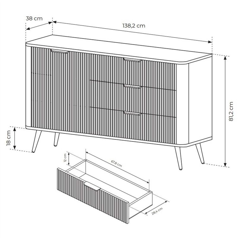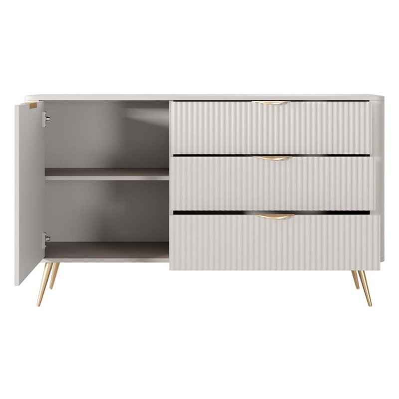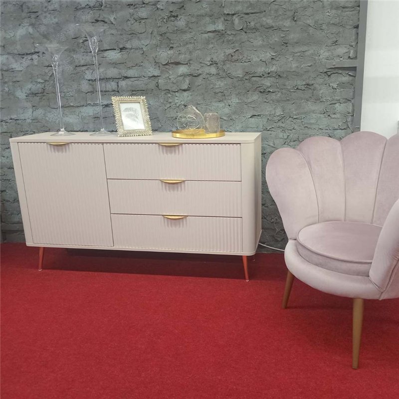 Сучасний комод Lante 1D3S/138 від польської меблевої фабрики Perfect Home, безперечно є оригінальним доповненням вашого сучасного інтерєру, адже у його конструкції використано оригінальні рішення, а саме: фасад тумби виготовлений з рифленого МДФ, кути тумби заокруглені, металеві ніжки та ручки на шухляді пофарбовані в один колір. Модель має 1 розпашні дверки, за якими розташовані полиці, та 3 висувні шухляди на телескопічних напрямних повного висуву. Корпус тумби виготовлений із якісного ламінованого ДСП, а фасад із структурного МДФ, які забезпечують довговічність, легкий догляд і привабливий зовнішній вигляд.