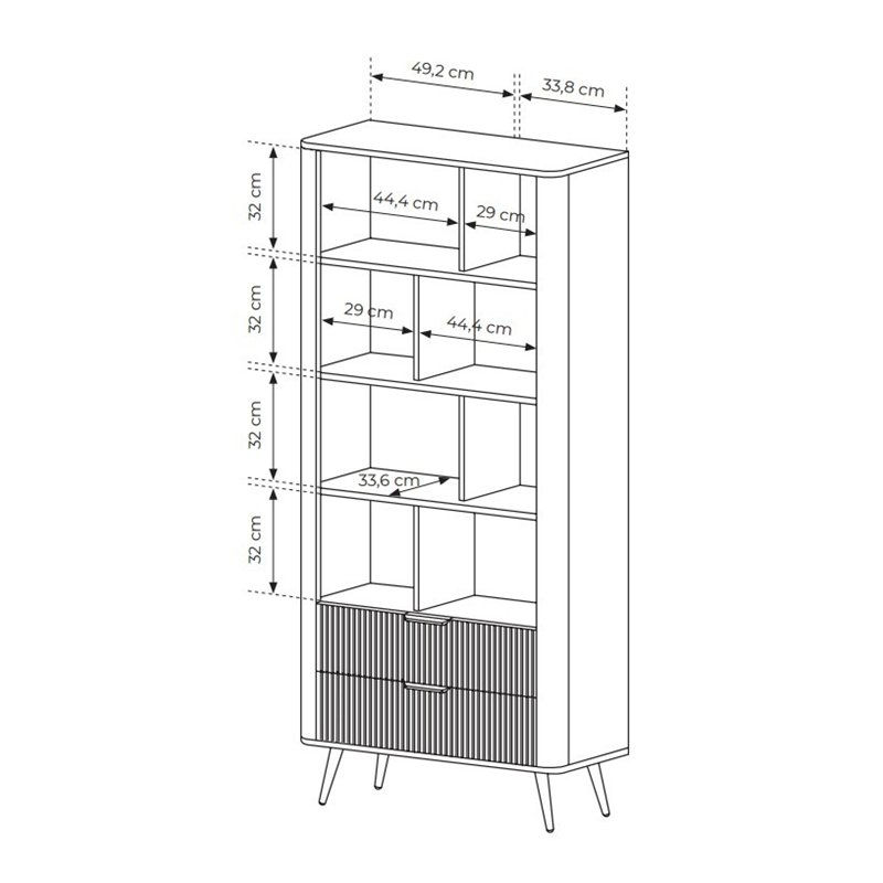 Сучасний стелаж Lante 2S від польської меблевої фабрики Perfect Home, безперечно є оригінальним доповненням вашого сучасного інтерєру адже у її конструкції використано оригінальні рішення, а саме: фасад тумби виготовлений з рифленого МДФ, кути тумби заокруглені, металеві ніжки та ручки на шухляді пофарбовані в один колір. Модель має відкриті полиці та дві шухляди на телескопічних напрямних повного висуву. Корпус тумби виготовлений із якісного ламінованого ДСП, а фасад із структурного МДФ, які забезпечують довговічність, легкий догляд і привабливий зовнішній вигляд.