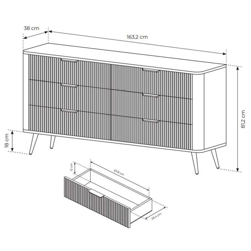 Сучасний комод Lante 6S/163 від польської меблевої фабрики Perfect Home, безперечно є оригінальним доповненням вашого сучасного інтерєру, адже у його конструкції використано оригінальні рішення, а саме: фасад тумби виготовлений з рифленого МДФ, кути тумби заокруглені, металеві ніжки та ручки на шухляді пофарбовані в один колір. Модель має 6 висувних шухляд на телескопічних напрямних повного висуву. Корпус тумби виготовлений із якісного ламінованого ДСП, а фасад із структурного МДФ, які забезпечують довговічність, легкий догляд і привабливий зовнішній вигляд.