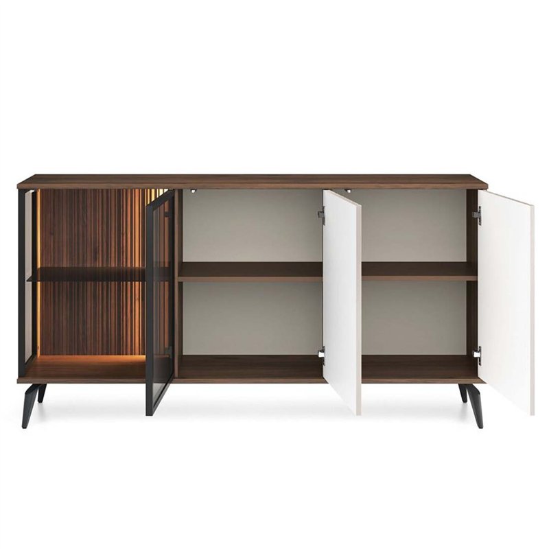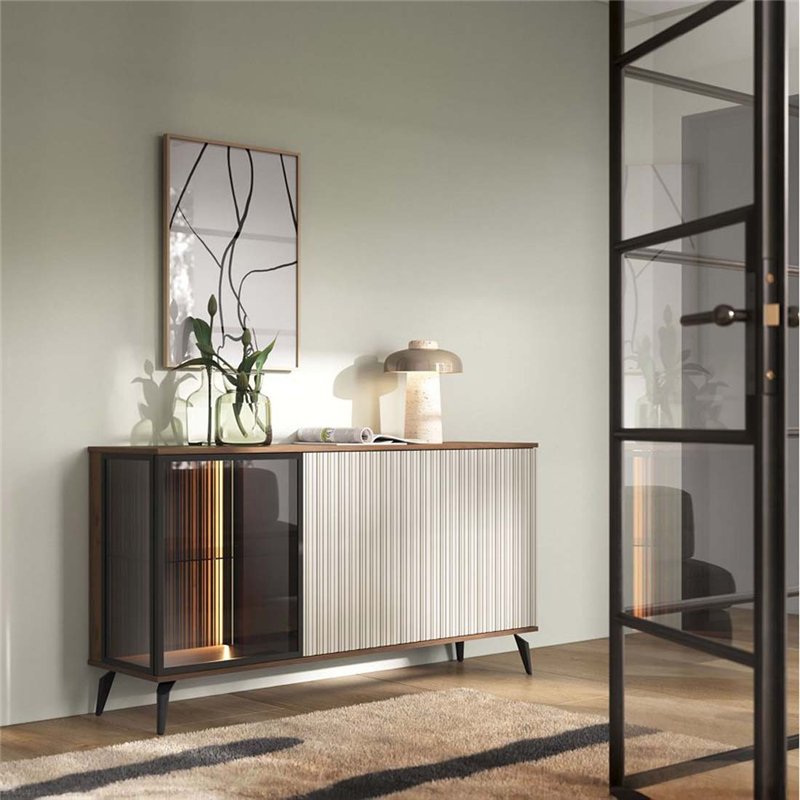 Сучасний комод Vici K154 3D від польської меблевої фабрики Perfect Home, безперечно є оригінальним доповненням вашого сучасного інтерєру. Модель має 3 дверки Корпус тумби виготовлений із якісного ламінованого ДСП а фасад із структурного МДФ які забезпечують довговічність, легкий догляд і привабливий зовнішній вигляд. Окрім того одна із дверок фасаду виготовлена із скла та підсвічується із середини а металеві ніжки пофарбовані в чорний колір, дверки відкриваються за допомогою системи Push-To-Open. Комод не тільки створює гарний та охайний вигляд в кімнаті а й організує зберігання необхідних речей.