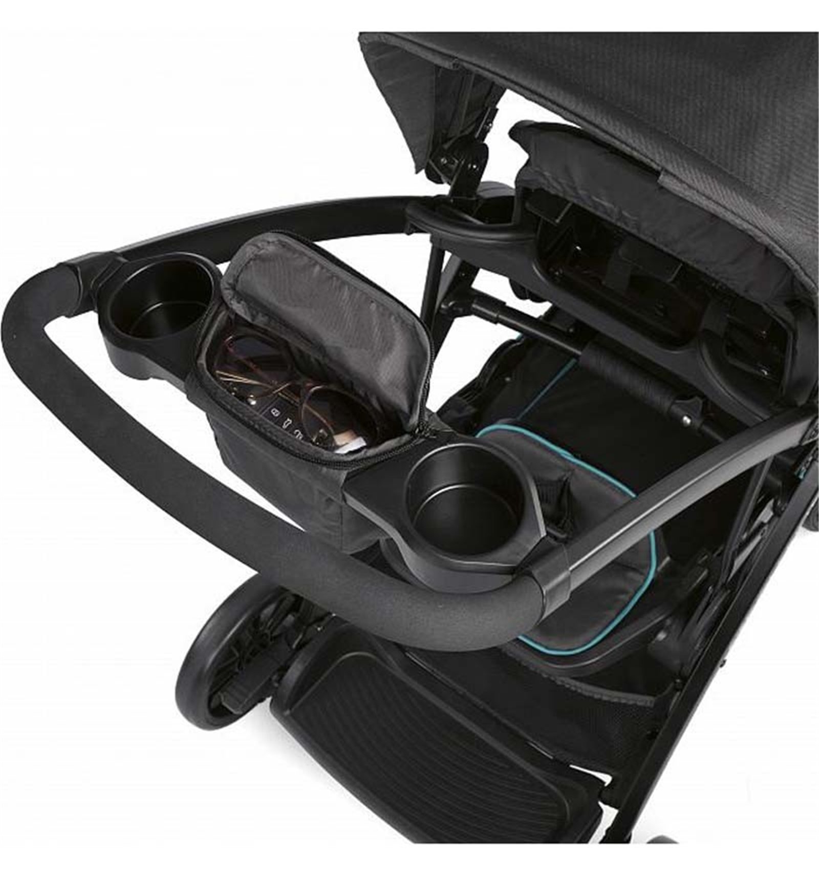 - На ручці розташований об’ємний лоток для батьків, з великою герметичною кишенею по центру;